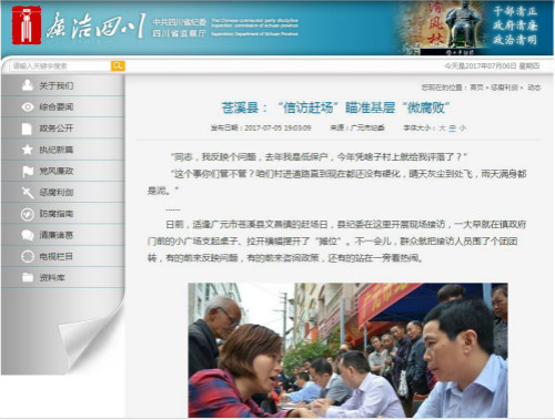 摘要:7月5日,四川省纪委网站“惩腐利剑”栏目刊文,关注报道苍溪县“信访赶场”瞄准基层“微腐败”。 省纪委网站截图(原标题:苍溪县“信访赶场”瞄准基层“微腐败”)“同志,我反映个问题,去年我是低保户,今年凭啥子村上就给我评落了?”“这个事你们管不管?咱们村进道路直到现在都还没有硬化,晴天灰尘到处飞,雨天满身都是泥。”......日前,适逢广元市苍溪县文昌镇的赶场日,县纪委在这里开展现场接访,一大早就在镇政府门前的小广场支起桌子、拉开横幅摆开了“摊位”。不一会儿,群众就把接访人员围了个团团转,有的前来反映问题,有的前来咨询政策,还有的站在一旁看热闹。此次基层接访主要针对群众身边的不正之风和腐败问题,还特地邀请了部分县纪委委员参加。当天共接受群众咨询事项100余项,受理群众信访问题21个,主要涉及交通、精准扶贫、民政救助等方面。“当前脱贫攻坚、新农村建设深入推进,低保、危房改建补助等大量惠民资金逐渐落地,基层矛盾和问题集中爆发,这就要求我们要变‘坐等来访’为‘主动下访’。”县纪委信访室负责人介绍说,为了更好地解决群众身边的不正之风和腐败问题,苍溪县纪委在全县组织开展了“信访赶场”活动,利用乡镇赶场日,在群众比较集中的地方摆摊设点开展接访活动,主动收集群众的信访举报,详细排查基层“微腐败”问题线索,坚持运用“四种形态”分类处置,打通全面从严治党“最后一公里”。今年以来,“信访赶场”活动在苍溪已经制度化、规范化,逐渐成为发现基层不正之风和腐败问题的主要渠道,县纪委按照每月一次的规定深入信访多发乡镇开展接访,乡镇纪委按照每半月一次的要求深入村组开展接访。目前,全县调查核实基层不正之风和腐败问题35个,立案26件,查处28人。