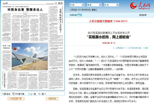 摘要:8月7日,《人民日报》刊文,关注报道苍溪县纪委建网上平台促政务公开。人民日报-人民网截图(原标题:四川苍溪县纪委建网上平台促政务公开“买瓶墨水的账,网上都能查”) “13日支付电汇手续费15元,经办人范怀礼。” “23日收到罗汉果改土项目资金60万元,经办人李晓英。”……四川广元苍溪县东兴村便民服务站的电子触摸屏刚安装好,就围满了看热闹的村民。“买瓶墨水的账都能查,村里还有啥事让咱放不下心?”村民刘忠勤一边翻动着触摸屏上的网页,一边称赞。 近年来,苍溪县纪委在其官网上设置权力运行监督平台,将涉及公权力的单位全部纳入其中,并将各单位行权细节在平台公开“晾晒”——例如,在平台上点开任何村的链接,其行权细节分为八个类别,所有细节都在网页上动态展示,接受监督。 目前,苍溪县通过该监督平台已公开行权细节20余万条。苍溪县委常委、县纪委书记王永介绍,群众上网查看行权细节时可同步举报,每项举报都会按管理权分配到相应纪检组织。目前,监督平台日均点击查询量超过3000人次,月均收集问题线索50余条,苍溪县纪检部门据此处分多名违纪人员,挽回经济损失39万余元。