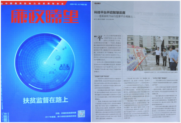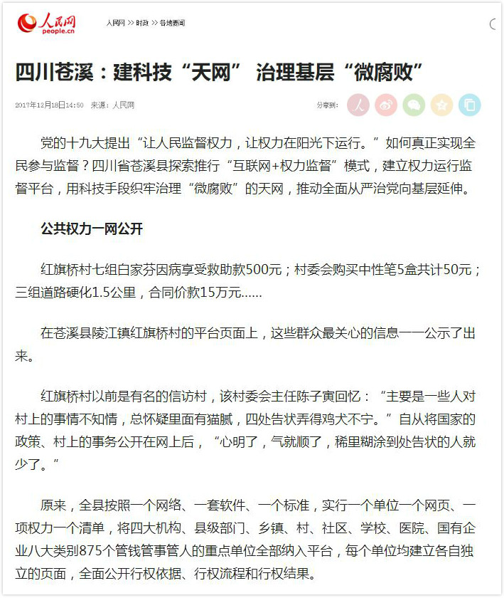 摘要:12月18日,《人民网》刊文报道:苍溪县建科技“天网” 治理基层“微腐败”。党的十九大提出“让人民监督权力,让权力在阳光下运行。”如何真正实现全民参与监督?四川省苍溪县探索推行“互联网+权力监督”模式,建立权力运行监督平台,用科技手段织牢治理“微腐败”的天网,推动全面从严治党向基层延伸。公共权力一网公开红旗桥村七组白家芬因病享受救助款500元;村委会购买中性笔5盒共计50元;三组道路硬化1.5公里,合同价款15万元……在苍溪县陵江镇红旗桥村的平台页面上,这些群众最关心的信息一一公示了出来。红旗桥村以前是有名的信访村,该村委会主任陈子寅回忆:“主要是一些人对村上的事情不知情,总怀疑里面有猫腻,四处告状弄得鸡犬不宁。”自从将国家的政策、村上的事务公开在网上后,“心明了,气就顺了,稀里糊涂到处告状的人就少了。”原来,全县按照一个网络、一套软件、一个标准,实行一个单位一个网页、一项权力一个清单,将四大机构、县级部门、乡镇、村、社区、学校、医院、国有企业八大类别875个管钱管事管人的重点单位全部纳入平台,每个单位均建立各自独立的页面,全面公开行权依据、行权流程和行权结果。平台自去年5月上线运行以来,已公开资金分配、贫困户评定等权力事项30多万条,真正实现所有权力在阳光下运行。如今,小到村上购买一支笔,大到县上实施上亿元的工程,全县9000多项重点权力运行情况都可以在平台上查询。全民监督一键直通“平台公示我享受耕地地力保护补贴3.2亩,可我实际上只享受了1.7亩,请纪委为我主持公道!”苍溪县陵江镇拱桥村村民赵泽福发现平台公开数据与实际情况不符,便在平台上举报,时任村支书和村主任分别受到党内严重警告处分。有着同样感受的,还有白桥镇同心村的龚继雄:“原以为建个平台就是做做样子,抱着试一试的态度举报,没想到很快就有了答复。”前不久,龚继雄在平台上发现有人房屋未受损却享受了洪灾补助,于是就写信举报。事情很快查清,该户房前堡坎滑坡,村上没有经过评议就将其纳入补助对象。镇纪委责令村支书作出检讨。据了解,该平台是一个开放式的互联网平台,无论近在咫尺还是远在万里,只要有网络就能参与、会用手机就能监督,敲一敲键盘、点一点鼠标、动一动手机,都可自由登陆平台查看公开情况,发现问题还可一键举报。“群众是根据自己了解的情况进行评价或举报,纪检组织就必须对单位权力运行进行逐项监督。”苍溪县委常委、县纪委书记王永介绍,权力每运行一次,纪检组织都要从程序是否合法、流程是否规范等方面作出自己的判断,并在网上永久记录留痕,出了问题倒查追究责任。平台运行以来,群众点击评价量突破2000万次,及时叫停违规事项186项,受理举报线索212条。问责追究一生留痕全县纪检监察组织查处违纪案件386件,同比增长55%;追缴违纪资金2991.7万元,是过去五年的3.3倍;现场向群众退还违纪款132万元,是过去五年的4倍……“能取得这样的成绩,苍溪县权力运行监督平台功不可没。”平台管理员介绍,群众在举报窗口输入举报内容、手机验证码提交后,平台自动分配到相应纪检监察组织进行办理,办理结果录入后平台会以短信的方式反馈给举报人,所有过程网上留痕。不仅如此,干部受到纪律处分、信访举报等情况也将“一生留痕”。“每名干部都有各自的电子廉政档案,随时记录其廉勤情况。人到哪里,档案就跟随到哪里。”县纪委常委侯军德介绍,纪检组织监督情况、群众信访举报、社会评价评判将自动汇总到后台,各单位的干部队伍怎样、当前什么问题突出、干部廉勤状况,党委和纪委“一点”便知。今年该县共有95名干部因“档案留痕”被暂缓提拔或取消评优评先资格,真正实现让干部在“聚光灯”下工作。