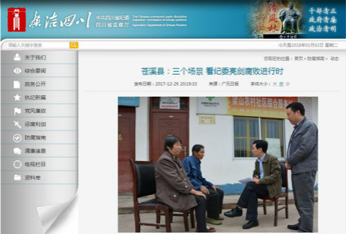 摘要:8月2日,四川省纪委网站“防腐指南”栏目刊文,关注报道苍溪县纪委建立权力运行监督网络平台,构建权力运行监督天网工程。县纪委干部在基层指导群众如何使用权力运行监督平台日前,广元市市委书记信箱里一封从广东发来的信件让苍溪县纪委成为全市纪检系统关注的焦点。这是一封特殊的“举报信”。署名“钱中国”的写信人自称是在广东务工的苍溪人。他在信中写道:苍溪县纪委在互联网上搞了一个权力运行监督平台,深受广大人民群众的喜爱,这个创新非常好,希望市委书记号召全市各级纪检监察机关向苍溪学习。信中提到的权力运行监督平台,是苍溪县纪委拿自身权力“开刀”,依托互联网建立起来的集权力公开、权力监督和问责处置于一体的网络平台。除涉密事项外,该平台将县纪委机关、班子成员和机关各室的行权依据、行权过程、行权结果全部网上公开,任何人都可以查看纪委该干什么、在干什么、干了什么。群众发现纪检干部监督不得力、执纪不规范、问责不到位等问题,也可以通过该平台一键举报。纪检监察干部监督室对不按程序行权的当面叫停,并在网上相应位置记录;对群众反映的纪检干部违规违纪的处理结果短信反馈举报人并视情况网上公开,举报人也可通过平台对举报办理情况进行查询。目前,苍溪县纪委将监督检查、纪律审查、纪律处分等6项外部权力,机关干部调配、大额资金使用等5项内部权力,班子成员和机关各室51项岗位权力在互联网上逐一公开;对排查出的194个廉政风险点,制定的320条具体防控措施已予以公布。该平台在县纪委运行取得明显成效后,苍溪县委积极支持、大力推动,全县875个单位依托互联网建立权力运行监督平台,明确将网上公开和网上监督分别作为党委主体责任、纪委监督责任的重要内容,坚持权力全程公开、监督全民参与、干部全域覆盖,构建起组织和群众监督、网上和网下监督、干部和权力监督的监督“天网”。此做法引起社会各界广泛关注和群众充分认可,平台日访问量近3000人次。