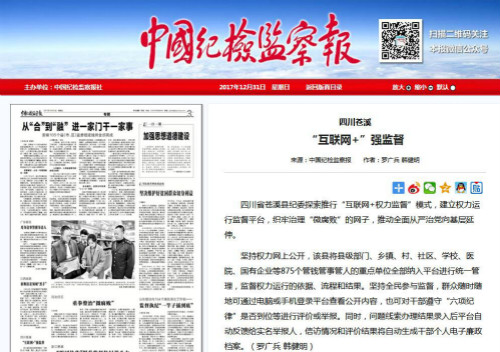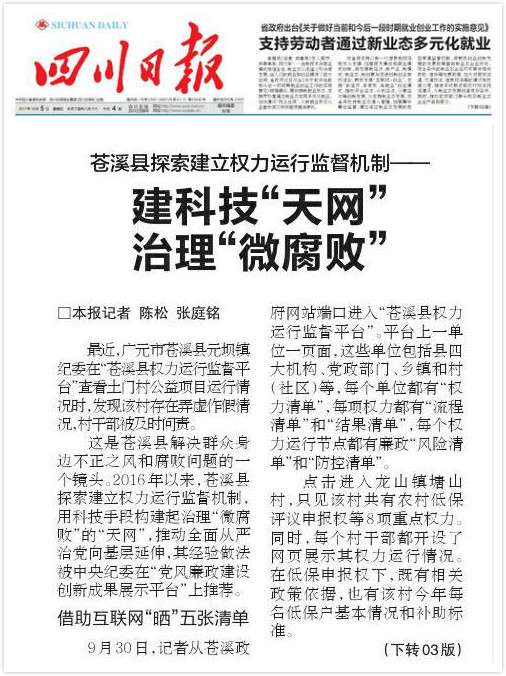 10月5日,四川日报头版关注报道苍溪建科技“天网” 治理“微腐败”。 最近,广元市苍溪县元坝镇纪委在“苍溪县权力运行监督平台”查看土门村公益项目运行情况时,发现该村存在弄虚作假情况,村干部被及时问责。 这是苍溪县解决群众身边不正之风和腐败问题的一个镜头。2016年以来,苍溪县探索建立权力运行监督机制,用科技手段构建起治理“微腐败”的“天网”,推动全面从严治党向基层延伸,其经验做法被中央纪委在“党风廉政建设创新成果展示平台”上推荐。 借助互联网“晒”五张清单9月30日,记者从苍溪政府网站端口进入“苍溪县权力运行监督平台”。平台上一单位一页面,这些单位包括县四大机构、党政部门、乡镇和村(社区)等,每个单位都有“权力清单”,每项权力都有“流程清单”和“结果清单”,每个权力运行节点都有廉政“风险清单”和“防控清单”。点击进入龙山镇塘山村,只见该村共有农村低保评议申报权等8项重点权力。同时,每个村干部都开设了网页展示其权力运行情况。在低保申报权下,既有相关政策依据,也有该村今年每名低保户基本情况和补助标准。 “公开是最好的‘防腐剂’,我们用互联网‘晒权’,为打通从严治党在基层的‘最后一公里’奠定了基础。”苍溪县委书记张寿于介绍,把从县委书记、县长到普通干部都纳入平台,“对全县875个单位、4709名干部实现权力运行公开。还公开各级重大决策、项目实施、人事安排等行权结果30余万条。”全民参与对权力运行实时监督 该平台后台设在县纪委。今年3月,县纪委在后台监督发现县文广新局工会费用支出突增,于是将该单位纳入检查重点,并及时对其进行问责。“苍溪各级纪检组织都可在该平台上按权限对权力进行监督,发现问题立即启动预警程序。”县纪委书记王永介绍。 该平台每一个页面下,都设有评价和举报功能且直通后台,既可对干部评价、举报,又能对权力事项展开评价、举报。苍溪群众可通过手机、电脑端,随时随地参与监督。 白桥镇白桥村村民郑明通过该平台发现村干部罗某在低保户认定中优亲厚友,便直接在平台上举报。镇纪委查实后,罗某被处分。 对纪委发现问题和群众网上举报,该县统一办结时限和公开结果。自去年5月平台正式运行以来,已受理群众举报线索212条,经调查核实,党纪政纪处分87人,移送司法机关处理3人。 同时,群众对干部的评判结果还在平台上生成干部电子廉洁档案。档案随人走,终身留痕。目前,平台点击已达190余万次,评价总数达1835万人次。