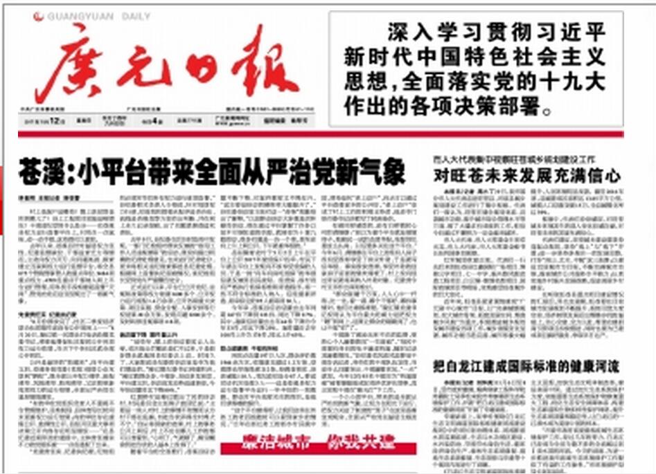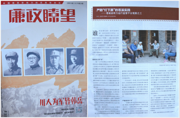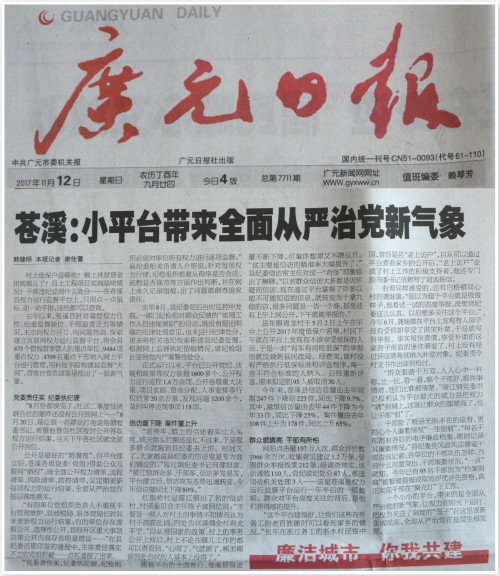 11月26日晚,四川电视台公共频道以《小平台 大作用》为题,对苍溪县权力运行监督平台进行了深入报道。此次电视专题节目通过案例剖析、跟踪采访等方式,对权力运行监督平台的建设、运行、管理等进行了深入解读,全方位展示了平台在管党治党中的突出作用和效果。截止目前,苍溪这一经验做法已连续引起中央、省、市重要媒体关注,他们先后对苍溪县建立权力运行监督平台管住权力、管住干部的做法进行了深入报道。10月5日,《四川日报》头版刊登《建科技“天网” 治理“微腐败”》11月25日,四川电视台《四川新闻》头条《建科技天网 破解基层权力任性》11月12日,《广元日报》头版头条刊出《苍溪:小平台带来全面从严治党新气象》