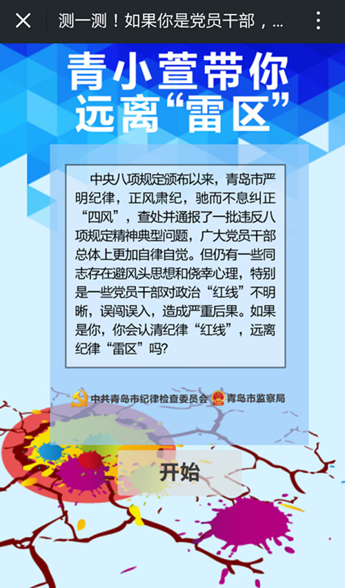青岛:微信答题强化党员干部党纪条规意识 摘要:青岛市纪委开发了“青小萱带你远离‘雷区’纠正‘四风’在线答题系统”,以单项选择的形式,把党章党纪条规分解到典型案例中。 日前,青岛市纪委开发了“青小萱带你远离‘雷区’纠正‘四风’在线答题系统”。该系统以近年来查处的违反中央八项规定精神典型问题为题材,结合党章党纪条规知识要点,设计成10道选择题,通过“廉洁青岛”微信公众平台向全市党员干部进行推送,同时设计了网页版答题系统链接在青岛市纪委监察局网站。截至目前,全市7.3万余名党员干部已参加了在线答题。 该系统以单项选择的形式,把党章党纪条规分解到典型案例中。党员干部通过选择正确答案,排除错误选项,可以改变对一些常见问题的模糊认识,加深对党纪条规的熟知程度。此外,该系统还对每道题进行了详细解析,并列出了引用条文和规定,为更好理解相关政策精神提供参考。 “这次答题让我印象很深刻。这些题目都跟我们日常生活和工作息息相关,通过在线作答让我加深了对党纪条规的理解。”一位市直机关干部在做完测试后表示。 青岛市纪委积极采取“互联网+”模式,运用信息技术和科技手段,进一步加强党风廉政建设宣传教育,把纪律和规矩转化为通俗易懂、易于接受的方式,持续释放寸土不让,越往后执纪越严的强烈信号。(山东省纪委)