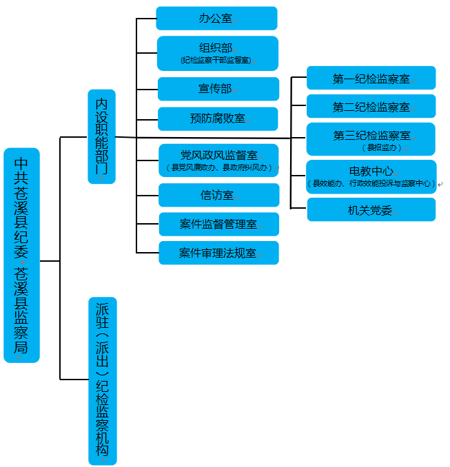 中共苍溪县纪委、苍溪县监察局合署办公,共有13个内设职能部门,具体为:办公室、组织部(纪检监察干部监督室)、宣传部、预防腐败室、党风政风监督室(县党风廉政办、县政府纠风办)、信访室、案件监督管理室、案件审理法规室、第一纪检监察室、第二纪检监察室、第三纪检监察室(县招监办)、电教中心(效能办、行政效能投诉与监察中心)、机关党委。县纪委、监察局共派出纪工委、监察分局8个。