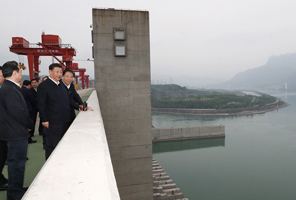 4月26日下午,中共中央总书记、国家主席、中央军委主席习近平在武汉主持召开深入推动长江经济带发展座谈会并发表重要讲话。这是座谈会前,习近平于24日下午在三峡大坝坝顶察看三峡工程和坝区周边生态环境。(新华社记者 鞠鹏 摄)
